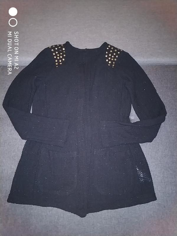 Жакет кофта, стан відмінний. (акрілік,поліестер,люрекс.) ПОГ 42, довжина рукава 59. Ширина плечей 34, довжина по спинке62. Колір чорний , з поблескиванием ✨. Клепки на плечах. Прекрасно підійде під будь-яку річ. В Наявності є багато різних варіантів одягу та взуття!!!Не ДОРОГО 🚀🚀🚀. Дивіться, вибирайте та підписуйтесь 🌼. Тут ви можете чудово доповнити ваш образ і гардероб, на всі сезони року 😊. При покупці декількох моїх лотів, отримуйте задоволення і Економте на доставці 💪🏻. Відправляю різними способами 👌, відразу після оплати 😉🧚.