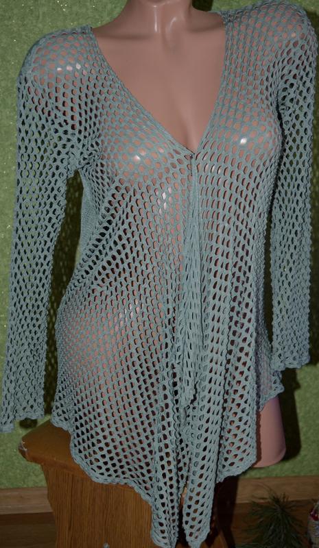 Ажурний кардиган оливкового кольору , довжина спинки по центру - 82 см , довжина по боковому шву ( під рукою ) - 45 см , ог - 110 - 116 см , рукав - 52 см , стан відмінний