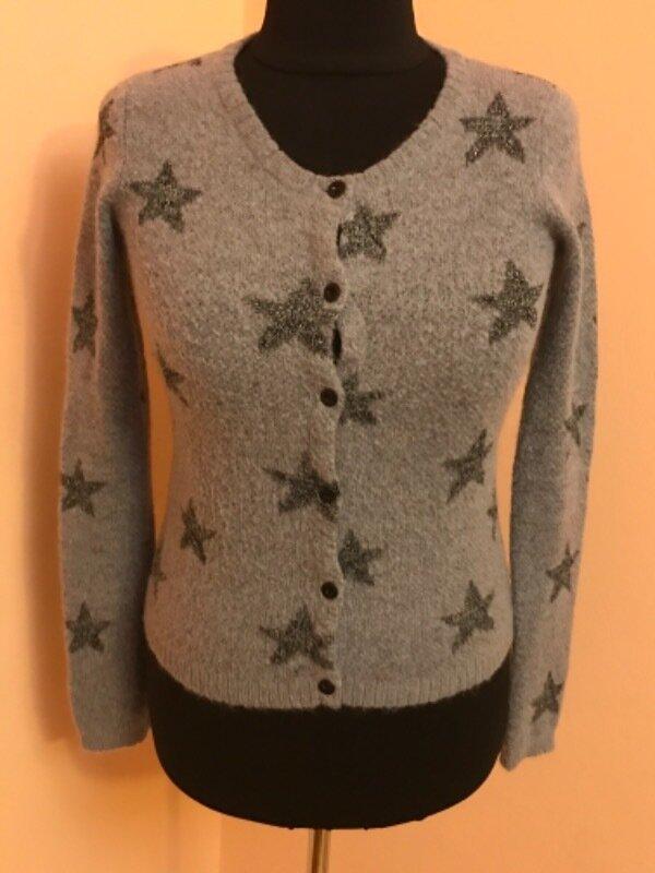 Класна кофта свро- голубого кольору , розмір 2 вказано.29%- мохер, 38%- нейлон, 29%- акрил, 2%- віскоза, 2%- поліестер. Довжина- 59см, плечі-39 см, рукав від плеча-68см, пог- 47см. Одягнута один раз.