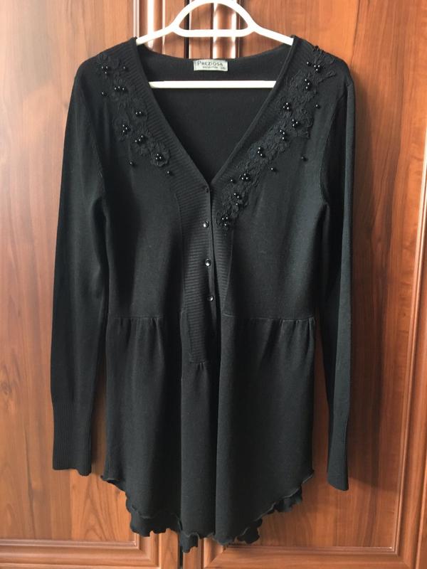 Оригінальна кофта з аплікацією зверху і цікавим низом.Виробництво-Італія.Розмір вказано L,XL.Більше підійде на М або L. ПОГ41,довжина рукава від плеча-62,довжина виробу від горловини-78.Склад є на фото,на дотик дуже приємний трикотаж.