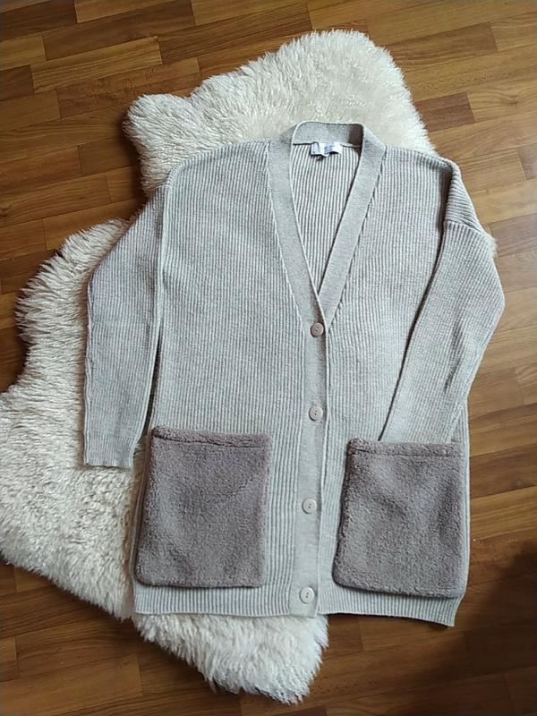 Стильний довгий кардиган з великими накладними кишенями з штучного хутра. В ідеальному стані. Довжина 90см.