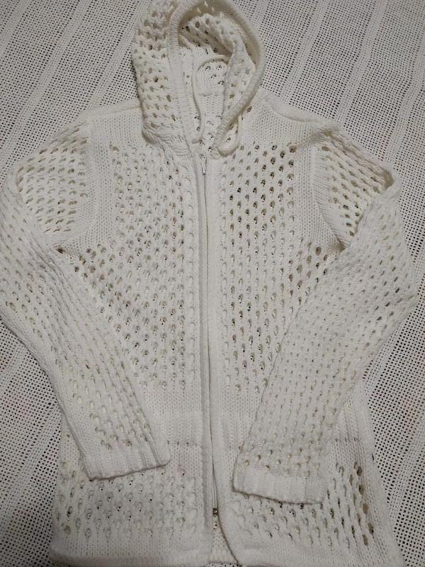 Біла кофта в дірочки, на замку. ПОГ 46 см, ПОТ 42 см, ПОБІДИ 45 см, довжина 67 см, довжина рукава 64 див. Стане незамінною річчю у Вашому гардеробі. Дуже класно і стильно виглядає з джинсами.