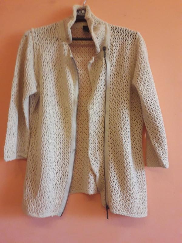 ажурная, машинной вязки, летняя, светло-бежевого цвета кофта, очень оригинальная, интересная, хлопковые натуральные нитки, добротный металлический замок-косуха, 44 европейский размер, ПОГ-52см., длина рукава-49см., длина кофты-63см., новая