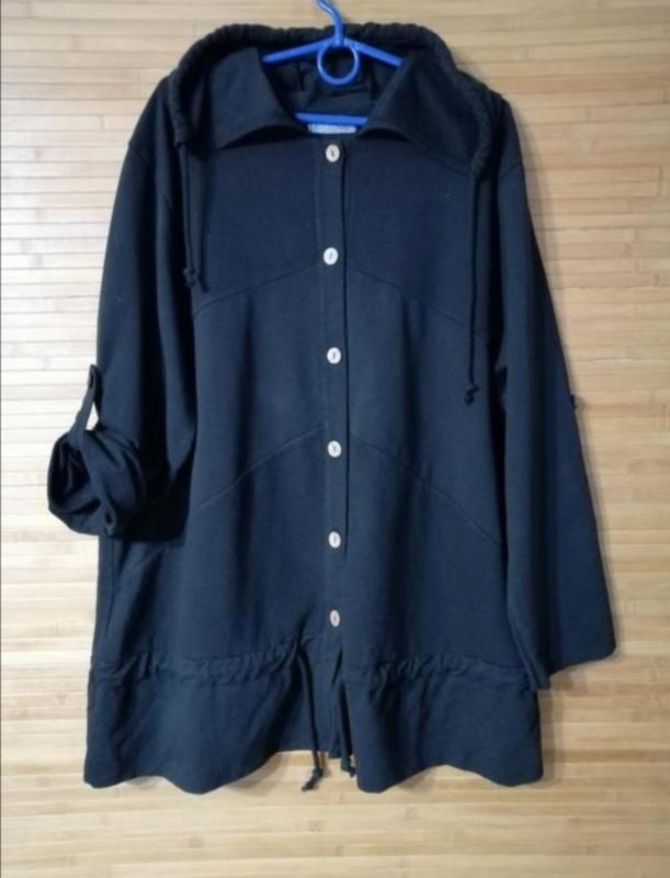 Класний чорний кардиган з капюшоном з млотного трикотажу двунить. Рукава підганяють на гудзик. Розмір 20-22. 🎀 Довжина 79,пог 63,низ 68,рукав від горловини 72/22,плечі 48