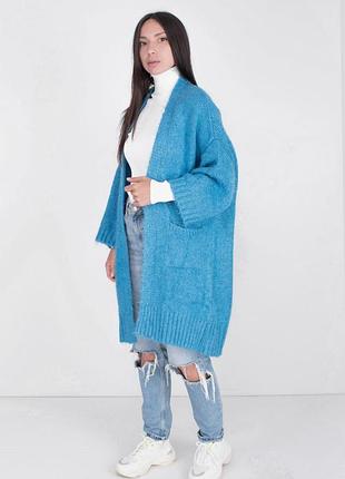 Жіночий синій кардиган Розмірний ряд: Норма Колір: Синій Параметри моделі: Зростання 1.70 см, груди 85 см, талія 60 см, стегна 90 см Розмір моделі: Універсальний Матеріал: Віскоза/поліамід/еластан Сезон: Весна/осінь Вид застібки: Без застібки Кількість кишень: 2 Еластичність: Так Країна виробник: Туреччина Розміри: Універсальний Приблизна розмірна сітка: Розмір Універсальний: плечі 50 см, напівобхват грудей 66 см, довжина рукава 56 см, довжина виробу 105 див.