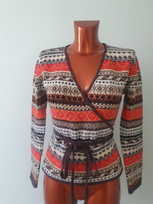 яркий кардиганчик из шерсти и мохера ,на запах длина 55 ширина 46 тянется талия и бедра регулируются пояском завязкой