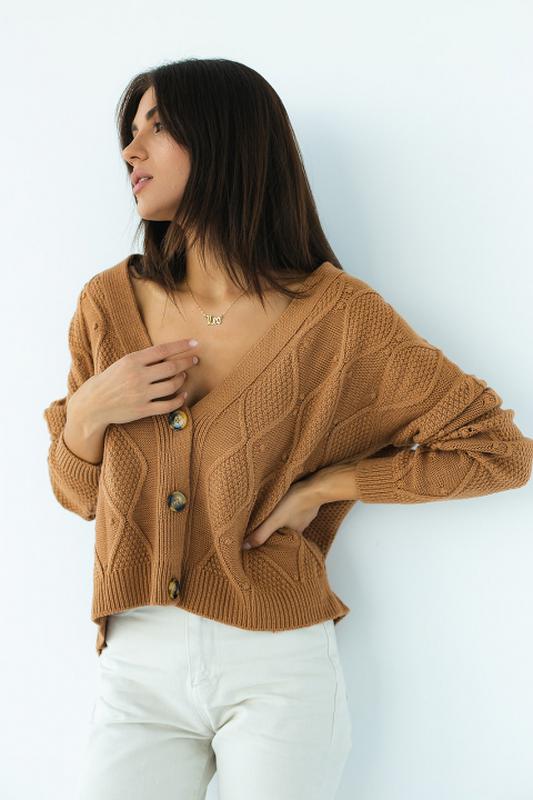 В'язаний кардиган з красивою ромбовидної в'язкої зігріє Вас в прохолодні дні і подарує відчуття комфорту. Три фактурні пластикові ґудзики прикрашають виріб, вносячи необхідний акцент. Манжети на рукавах і знизу кардігана цікаво обіграні в'язкої коса. Лінія плечей опущена, а фасон вільний. Жіночий в'язаний кардиган можна купити в нашому інтернет магазині жіночого одягу LUREX за доступною та приємною ціною для всіх типів покупців. Довжина рукава від горловини, см80см Довжина рукава по внутрішньому шву, см 46см Ширина під проймами рукавів (над грудьми), см62см Ширина по низу, см 56см ХАРАКТЕРИСТИКА ТОВАРУ Бренд LUREX Країна Туреччина Матеріал В'язка Склад тканини 100% акрил Параметри дівчата моделі 90*60*90 зростання 173Размер на фотоЅ