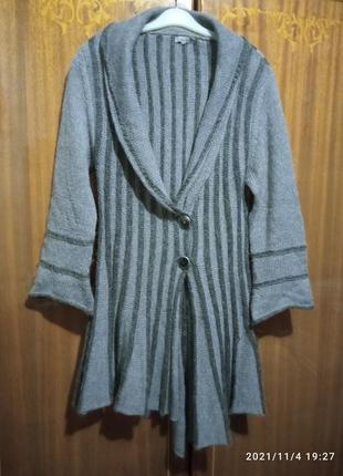 світло сіра з темними поздовжніми смугами, виглядає красиво,мохер + вовна,зроблена в Італії,пог-54см,пот-50см,побіди-63див, тягнеться,дл.рукава-57см, довжина кофти-82см.