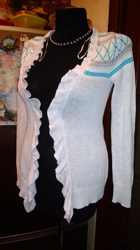 Кардиган 42р.з воланами в хорошому стані,зверху оздоблений паєтками,56% х/б,ПІТ 38,довжина 67,плечі 30,рукав 61,св. сірого кольору.Манекен 46р.