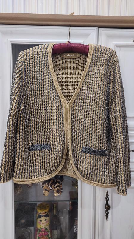 Кофта Conbipel, розмір 50, але скоріше всього до 50, китайський XL, довжина 50, довжина рукава 47, ПОГ, ПІТ 55, застібається на гачок. Склад тканини 40% бавовна, 30% нейлон, 30% поліестер. Вплетена темна нитка з люрексом, імітація кишенею.