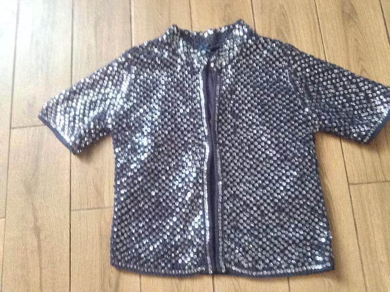 Суперская класна модна в'язана жилетка в паетках ! Дуже стильна ! На підкладці ! Розмір вказано 14! Підійде на наш S-M ! В хорошому стані ! Довжина 55 см ширина під пахвами 44 см