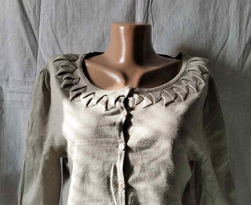 Сучасний,натуральний,стильний. З цікавою обробкою по горловині та рукаву. Всі виміри зроблені в спокійному (не розтягнутому) стані. ФОТО НА ТІЛІ НЕМАЄ. Довжина(по спині) 48 Завширшки(пахви) 49