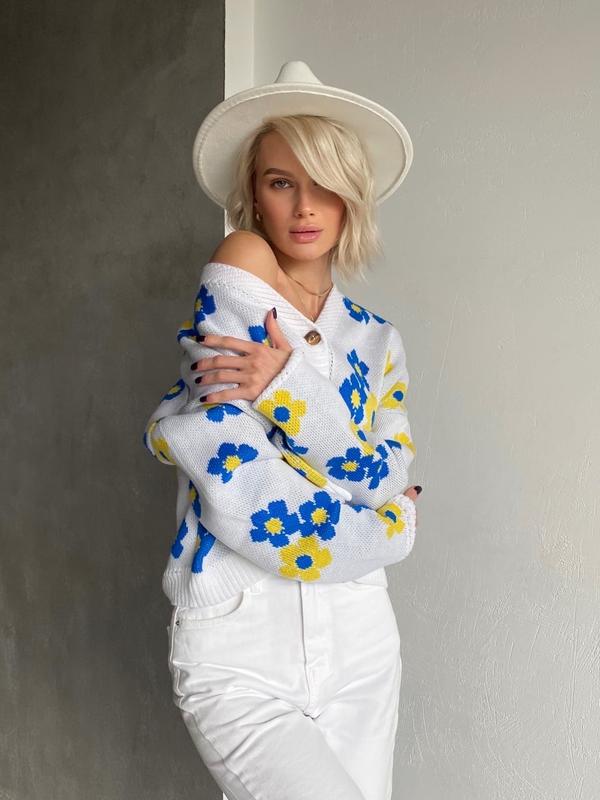 Арт 488 Кофта РОМАШКА 🇺🇦 Неймовірно стильна, та символічна кофта оверсайз, з принтом яскравих квітів Розмір : one size 42-48 Виповнена з акрилу Застібається ґудзиками по переду 1290 грн