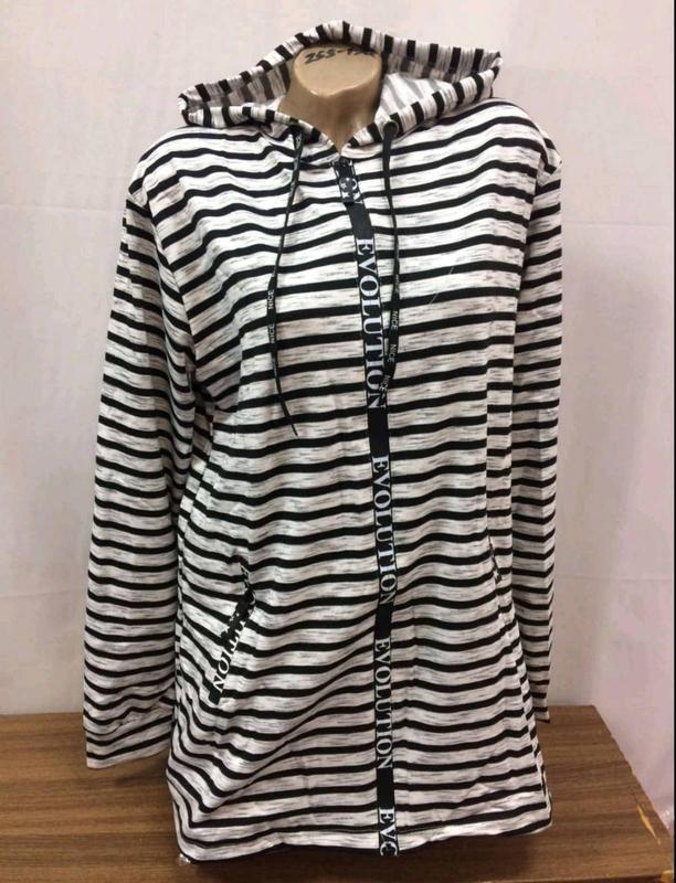 Женский кардиган большой размер. Молния пл всей длине. Карманы на молнии . Капюшон . Крой - трапеция. Качественная фурнитура. Качество отличное. Размеры в наличии 56( идет на 52) дл.75 см, рукав 65 см , грудь 112 см, бедра 120 см 58 ( идет на 54 ) дл.76 см, рукав 67 см, грудь 114 см, бедра 126 см 64 ( идет на 60) дл.82 см рукав 70 си, грудь 126 см, бедра 140 см ) Замеры указаны в нерастянутом состоянии , растяжимость не высокая , потянется на 1- 2 см . Обращаю Ваше внимание , что это верхняя одежда- должен садится свободно с расчетом поддеть футболку. Внимание! Полоски темно зелёные. Качество оооооочень хорошее. Распродажа на опте. Цена 259 грн