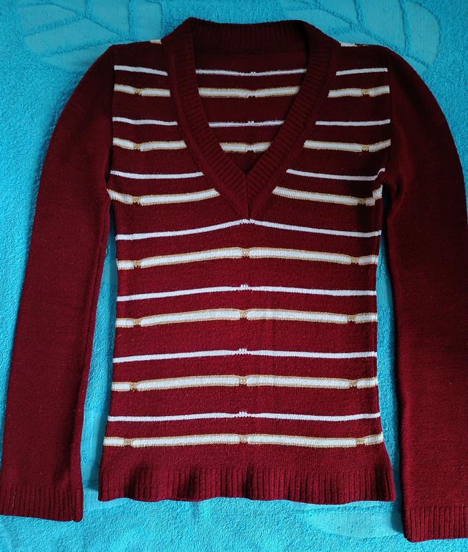 р. 42-44, v-образний виріз, тягнеться. Ідеально сидить по фігурі. Є невелика зачіпка внизу на спині фото 4. Довжина по спинці 59см, ПОГ=37см у вільному стані, довжина рукава=60см.