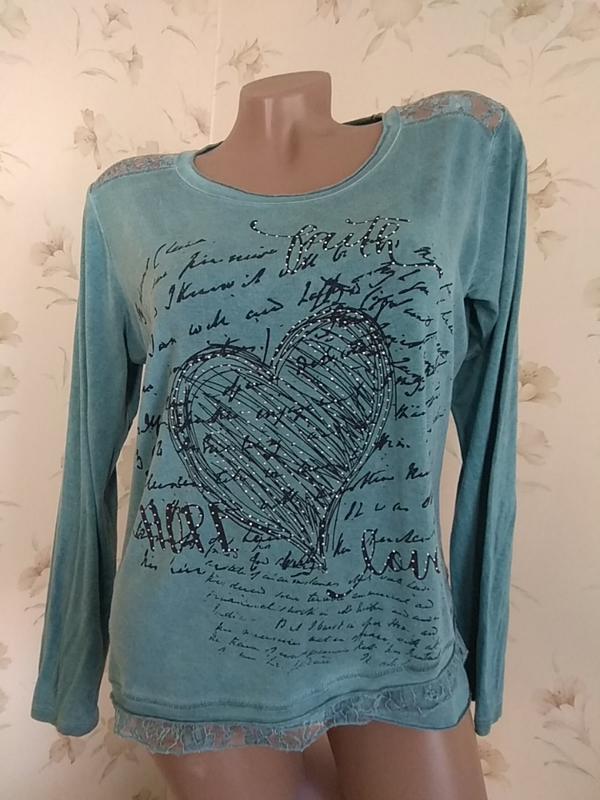 Дуже стильна молодіжна кофта-блузка з довгим рукавом ніжного рожевого кольору. Колір,як на 1 і 2 фото. Легка ніжна тканина (тонкий трикотаж), комбінована ніжним мереживом. Спереду прикрашена написами і маленькими стразами. Виглядає приголомшливо і стильно завдяки ефекту "варенки". в плечах 38 см. Довжина рукава від плеча 56 см. ідеальний Стан. Сліди шкарпетки відсутні. Дефектів немає.