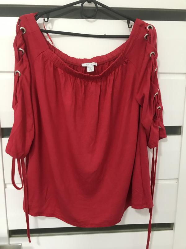 Червона кофтина, на рукавах завязки Резинка зверху, можна опускати плечика, приємний матеріал до тіла