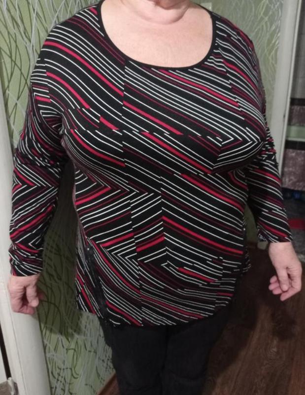 Приємна кофтинка, бірку зрізано, але на дотик схоже на віскозу, відмінно тягнеться, знизу по боках є декоративні блискавки. Заміри в спокійному стані НОГ 63, НОС 64 Довжина спереду 68 позаду 72