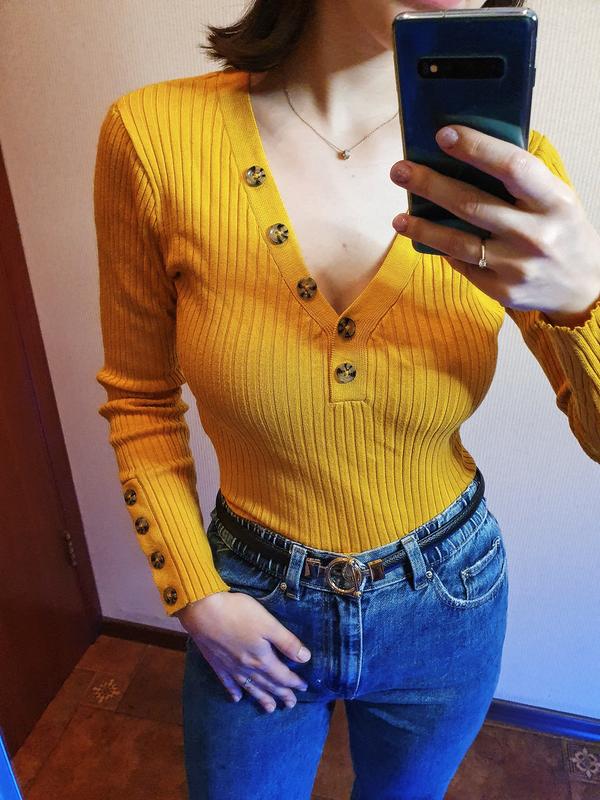 Кофта в рубчик з вирізом ,на розмір с.Добре тягнеться,є запасний ґудзик.