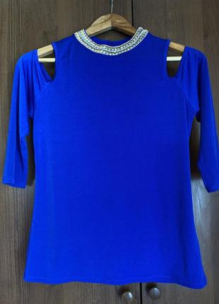 Кофта синего коляска Тканина тонка С открытыми плечами Шея украшена камушками Зади застегивается на пуговицы