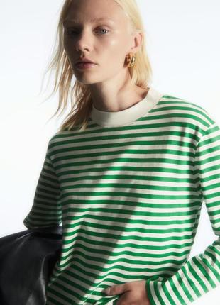 Лонгслів COS В НАЯВНОСТІ Розміри XS, S Колір біло-зелена смужка 100% органічна бавовна середня щільність, не тонкий Неперевершені лонгсліви COS! Вони дійсно самі найкращі! Дуже гарна якість, дуже комфортні, дуже стильно виглядають! Любий колір може бути базою!