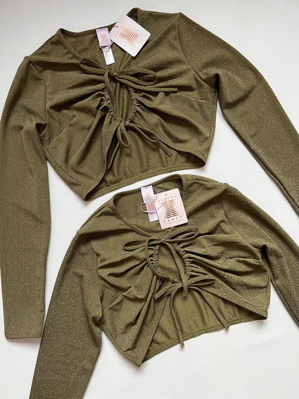 Блискучий лонгслів Бренд: Rihanna SAVAGE x FENTY М‘який мерехтливий люрекс, довгі рукава, функціональні зав‘язки спереду Колір: Військова олива Розмір: М