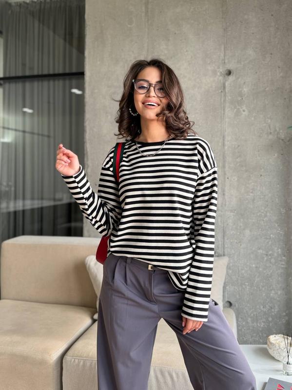 Лонгслів смужка тканина Туреччина 🇹🇷 колір білий з чорним світлий беж з чорним трьохнитка петля діагональ 42-44(1),46-48(2) 560 грн 50-52(3),54-56(4),58-60(5) 615 грн