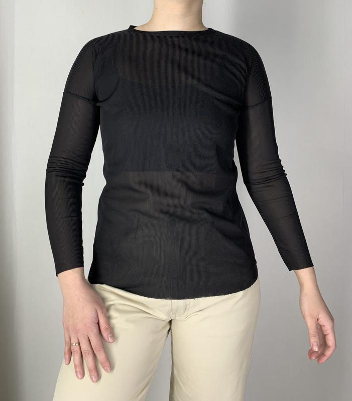 Лонгслів-сітка чорного кольору, розмір S Довжина 66 см, довжина рукава від горловини 61 см, напівобхват грудей 49 см У складі 100% поліестер Стан нового