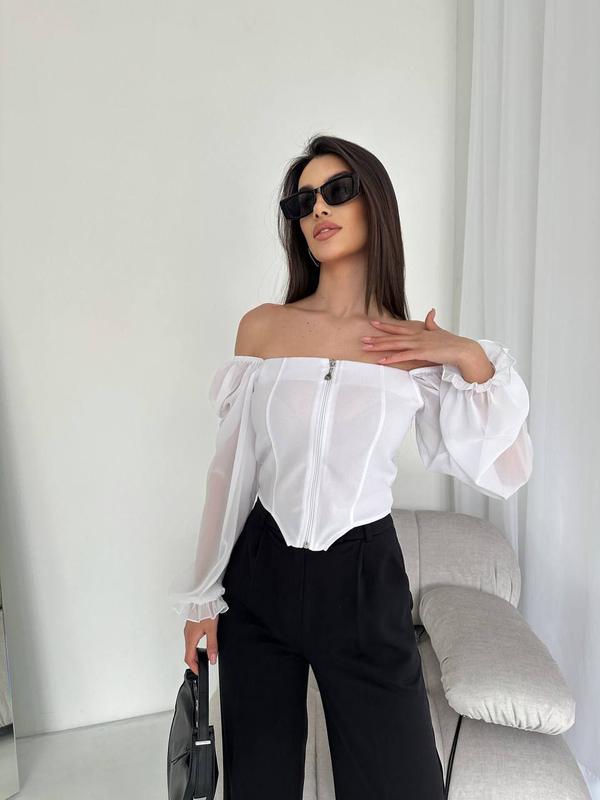 В Наявності ‼️ Фото наживо Кофточка 🔹️Модель: 193 🔹️Тканина: креп-дайвінг + шифон 🔹️Розміри: 42-44, 46-48 🔹️Кольори: білий, чорний Заміри : 42-44 Обʼєм грудей: 80-90 см 46-48 Обʼєм грудей: 88-98 см Довжина спереду виробу : 34 см Довжина рукава: 62 см