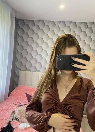 Ця кофта — це обтиснута коричнева блузка з довгими широкими рукавами. Вона має глибокий V-подібний виріз і збірку на грудях, що надає їй оригінальний вигляд. Тканина, здається, має легкий блиск, що робить кофтинку більш елегантною. Рукави мають гумку на зап'ястях, що створює об'ємний ефект.😻