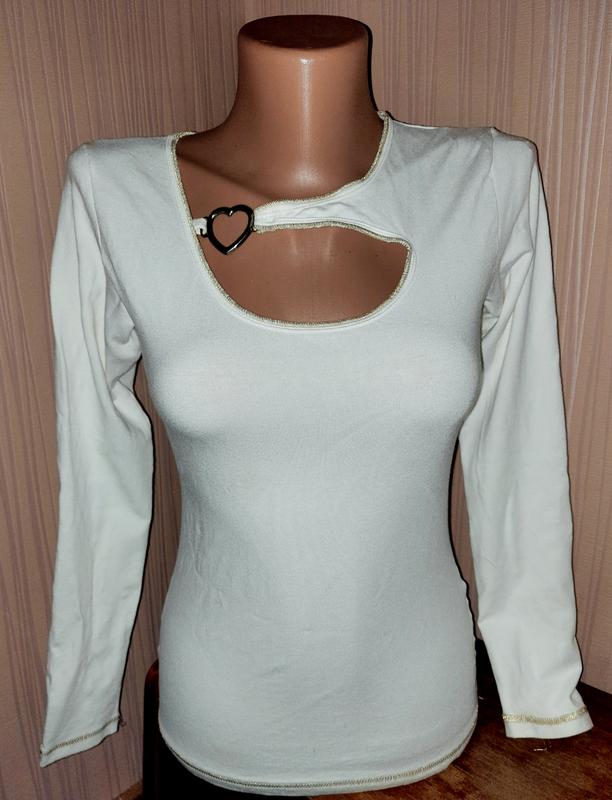 Колір білий, фурнітура-металеве серце, рукав довгий. На грудях гарне декольте. Тканина непрозора-трикотаж бавовна з віскозою. Модель облягаюча. Розмір М(46). Заміри: ширина в грудях-38 (тягнеться до 48), довжина-51см(тягнеться до 60см), довжина рукава з плечем-61см (тягнеттся до 71см). Річ б/в у відмінному стані _ (НІ СЕКОНД)_ Напишу додаткові заміри до потреби. Пересилаю після оплати на мою картку. Поверненню не підлягає.