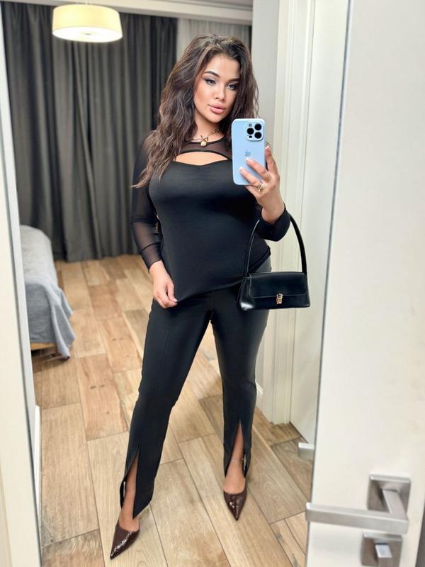 Стильний лонгслів з улюбленим декольте Модель 1114 ✅ Тканина :мікродайвінг + ніжна сіточка ✅ Розміри 48-50 52-54 56-58 ✅ Кольори: чорний Заміри 1114 Довжина 62 см Ог рекомендуємо : 48-50 до 110 см 52-54 до 120 см 56-58 до 130 см