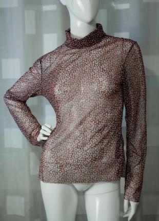 Прозорий гольф- сітка. Має довий рукав та горлишко, Дрібний принт у квіточку червоно-чорного кольору. Добре тягнеться , потребує нижнього шару(білизни). Матеріал-сітка, поліамід Колір-червоний, чорний, білий Розмір- L Заміри (см) Пів об. плечі- 41 Пів об. груди- 43 Пів об. талія- 40 Пів об. бедра- 43 Довжина від плеча- 60 Довжина рукава-58 Стан- 10\10 №296