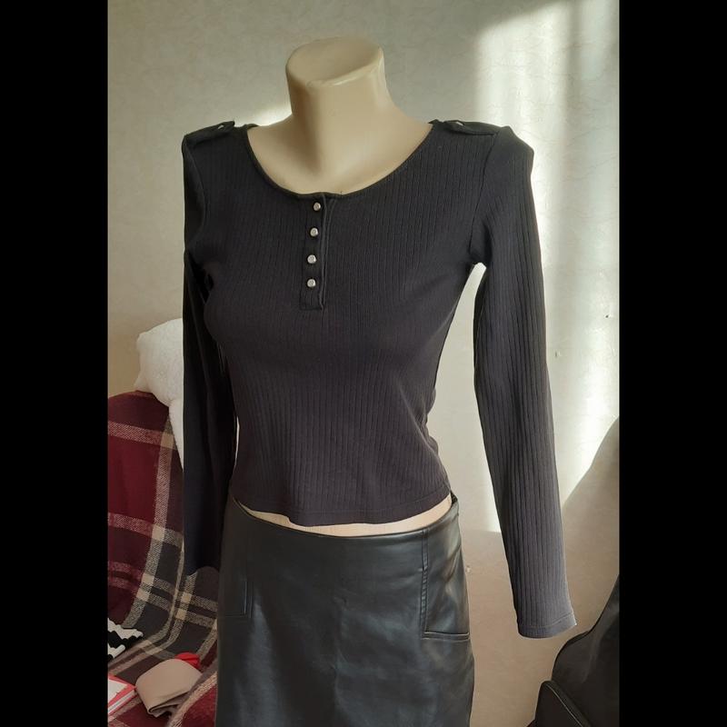 355 Чорний жіночий лонгслів в рубчик. Стан хороший. Розмір S Ширина плечей 34 см Напівобхват грудей 36 см Довжина рукава 56 см Довжина 45 см.
