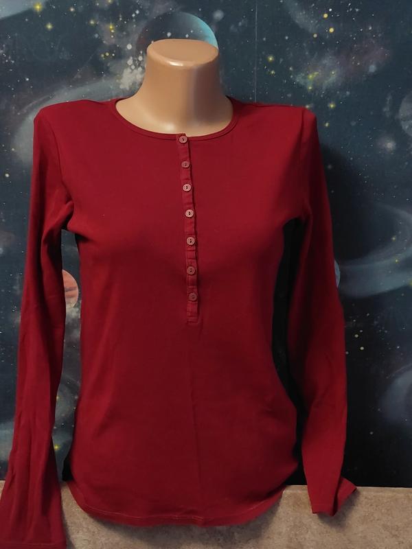 лонгслів кофта в ідеальному стані, без дефектів, колір бордовий, камера не передає реального кольору. Довжина по спинці 55 см, пог 42 см, довжина рукава від плеча 55 см розмір вказаний S, підійде і на М склад 100 котон