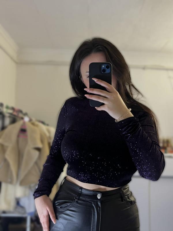 Кроп-топ. Вкорочена кофта. Розмір М. З блискітками. В фіолетовому відтінку. Застібається на шиї. Відкрита спинка. Блискітки не осипаються.