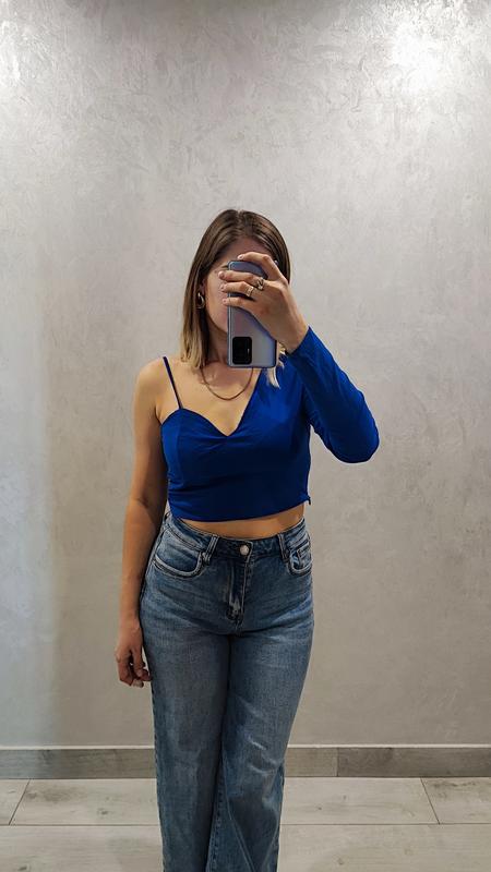Цікава кофтинка з рукавом і оголеним плечем. Тканина стрейчева, дуже гарно тягнеться .Збоку на замочку. Стан ідеальний. Розмір указано L. Орієнтуйтесь на заміри Півобхват грудей -40 півобхват в талії-35,5 довжина-39 рукав-58 Мої параметри 93/72/98, зріст 160. на мене трішки великувата.