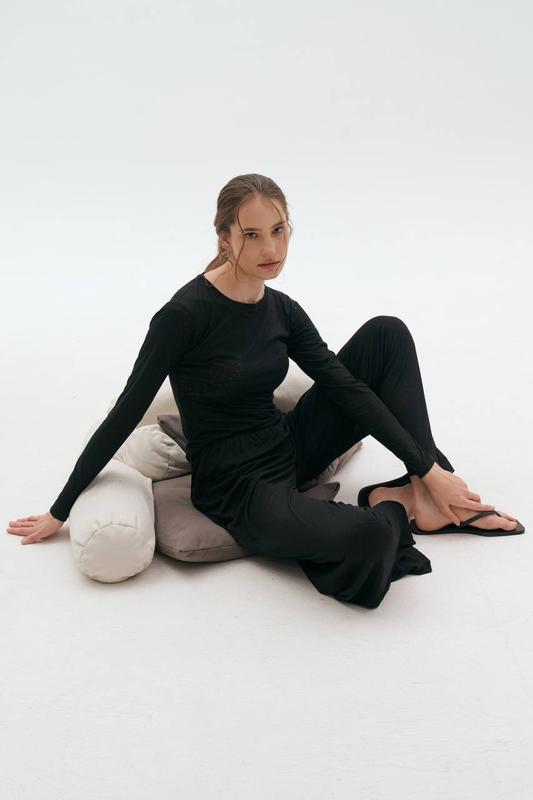 Лонг напівпрозорий Розмір: xs/s, ml тканина: 75% витяжка з евкаліпту 15% поліестер Колір: молоко, чорний Штани також у продажу