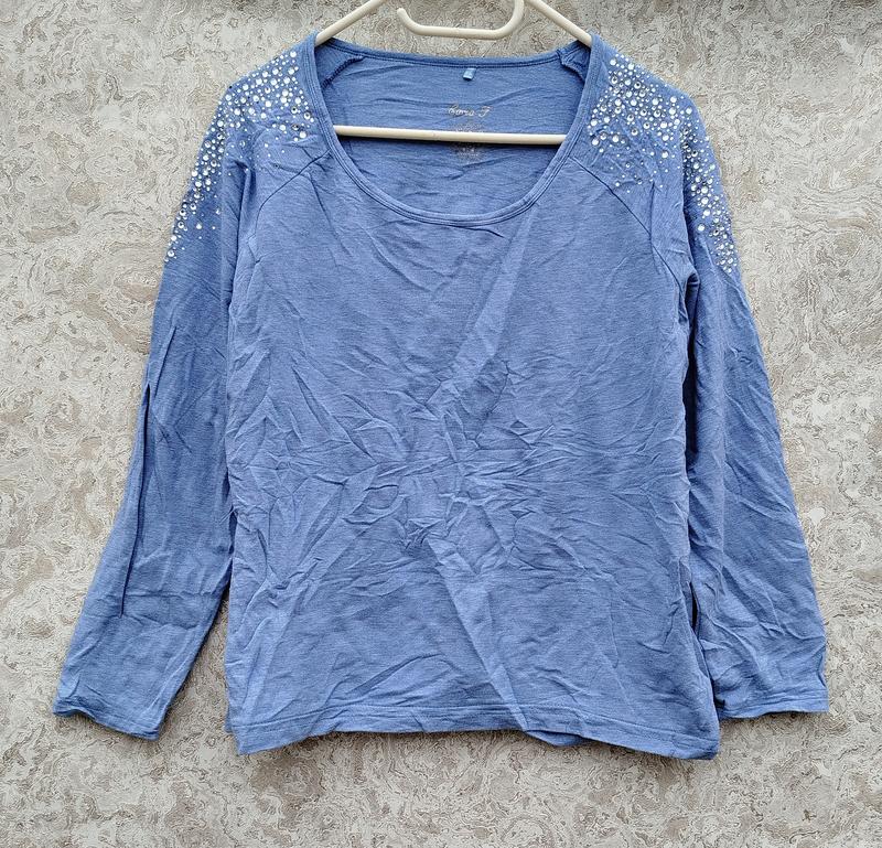 Секенд Америка примята с мешка! не хватает несколько стразиков с одной стороны длинна от шеи к низу 59см длинна рукава от шеи к низу 65см ширина от подмышки до подмышки 54см талия 54см низ 58см цвет джинс(фото искажает) ткань футболочный трикотаж обмена и возврата нет!
