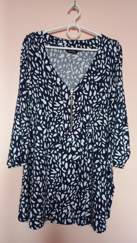 Кофтинка в ідеальному стані, як новенька! Якісна, фірмова, стильна, легенька, натуральна, трикотажна, дуже м"якенька та приємна до тіла, гарно тягнеться, батальна! Колір темно синій в білі плямки! Заміри: довжина від плеча 75, підмишки 60 см у вільному стані, тканина тягнеться до 65 см, по низу 70 см у вільному стані, тканина тягнеться до 75 см!! У продажу ще є речі такого розміру, пишіть, запитуйте, буду рада щось запропонувати)