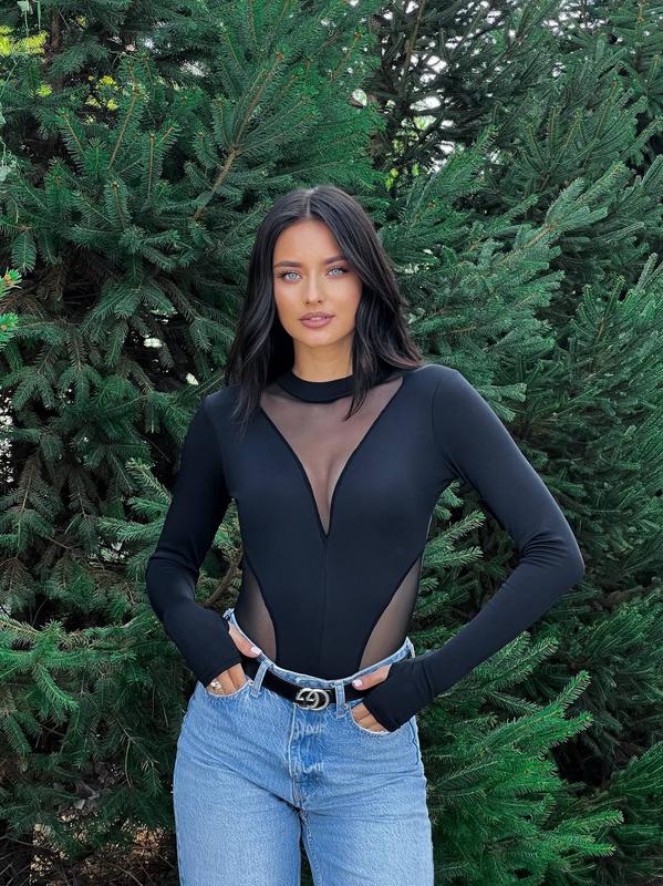 Ідеальне трикотажне боді з вставками із сітки та вирізом для пальчика