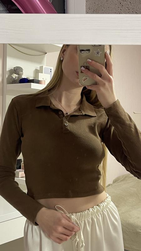 Трикотажна кофтинка-поло вкорочена. Трендового шоколадного кольору. По бірці розмір М, підходить і на xs-s. Стан ідеальний.