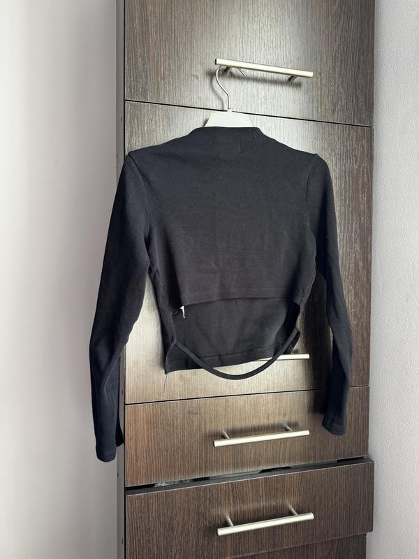Базовий чорний кроп-топ із довгими рукавами. Він має мінімалістичний дизайн із округлим вирізом горловини та обтислим кроєм. Тканина виглядає еластичною та м’якою, що забезпечує комфорт при носінні.