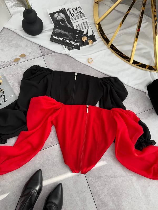 193 Тканина: креп-дайвінг + шифон Розміри: 42-44, 46-48 Кольори: білий, чорний, червоний Заміри : 42-44 Обʼєм грудей: 80-90 см 46-48 Обʼєм грудей: 88-98 см Довжина спереду виробу : 34 см Довжина рукава: 62 см