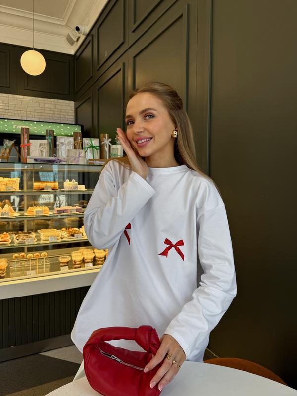 Топовый лонг с бантиком – настоящий must-have в гардеробе, который подходит для любого сезона и стиля. 💫 Благодаря оверсайз-крою он выглядит стильно и добавляет образу легкости. Материал обеспечивает комфорт, позволяет телу дышать и отлично поглощает влагу. Дизайн с бантиком добавляет изюминку, а качественное нанесение принта гарантирует долговечность – даже после многочисленных стирок он остается ярким. Украинское производство – гарантия качественного пошива и внимания к деталям.