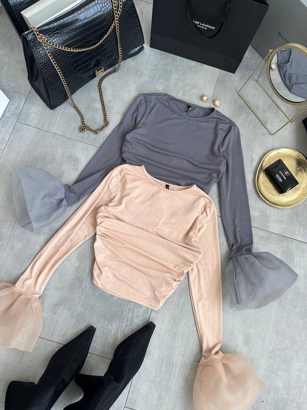 🔠🔠🔠🔠🔠🔠🔠 Ідеальне поєднання стилю та зручності: лонгслів з воланами для будь-якого приводу🤩 Модель 314 Тканина: турецька віскоза + органза Розмір: Xs-M ( one size ) Кольори: беж, графіт