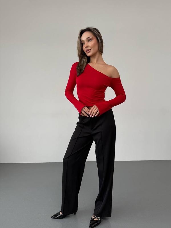 Жіночий лонгслів середньої довжини з асиметричним вирізом відкритим одним плечем довгими р...