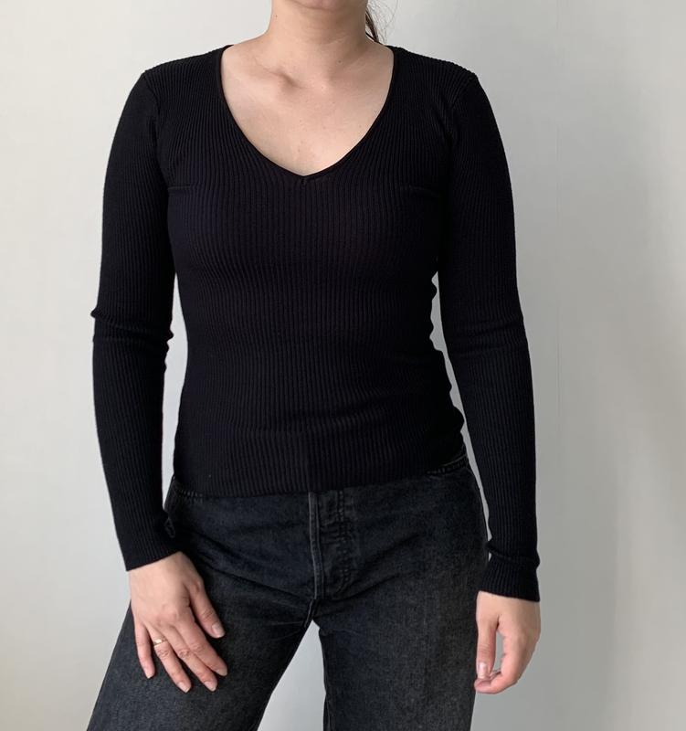 Лонгслів чорного кольору у рубчик Розмір М Фірма: Amisu У складі 70% віскоза, 30% поліамід Довжина 57 см, довжина рукава 61 см, напівобхват грудей 31 см(тягнеться) Стан ідеал