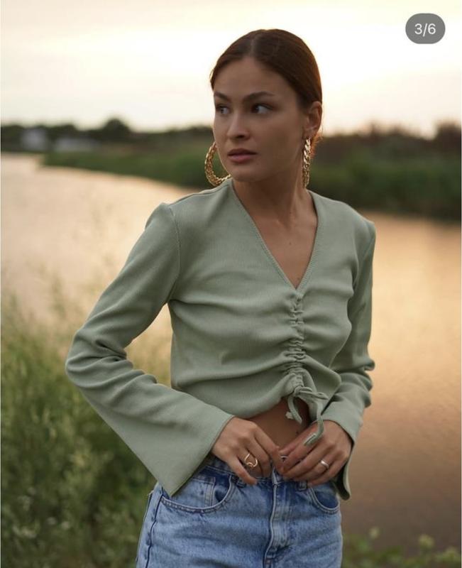 Укорочений топ із затяжкою фісташкового кольору, в ідеальному стані. Розкльошені рукава. Розмір вказано М Виміри: Довжина - 42 см Довжина рукава - 57 см Ширина плечей - 40 см Ширина грудей - 45 см