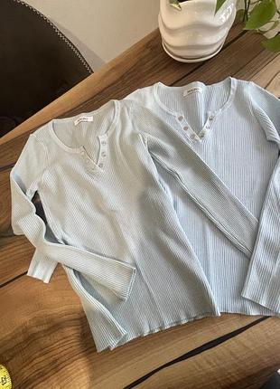 Дві кофтинки в рубчик, неймовірно мякенькі, натуральні, не заеошлатяні(нові) одна блакитна, інша мятного кольору. По фото кольори передані, заміри на фото, обидві на розмір с, або маленьку м